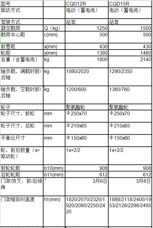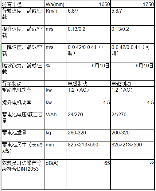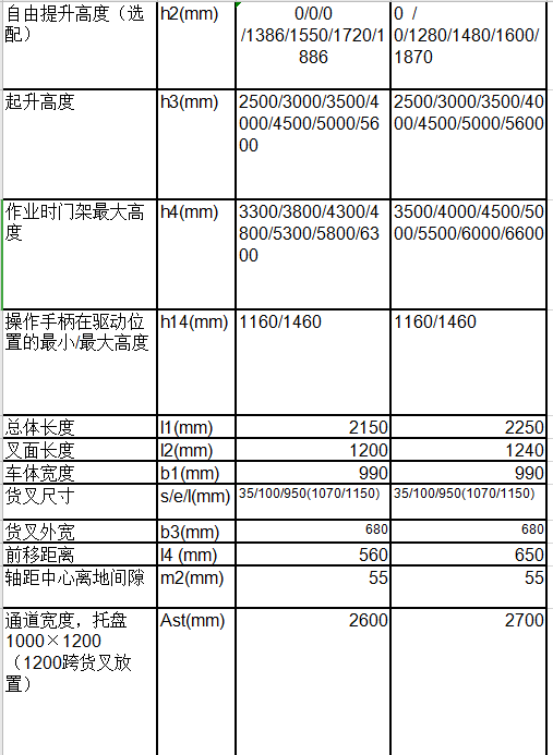 ■ 内置充電器、全自由提升、貨叉側移,可作為客戶的選配,門架起升高度為2.5米至5.6米,承載能力由1噸到1.25噸;