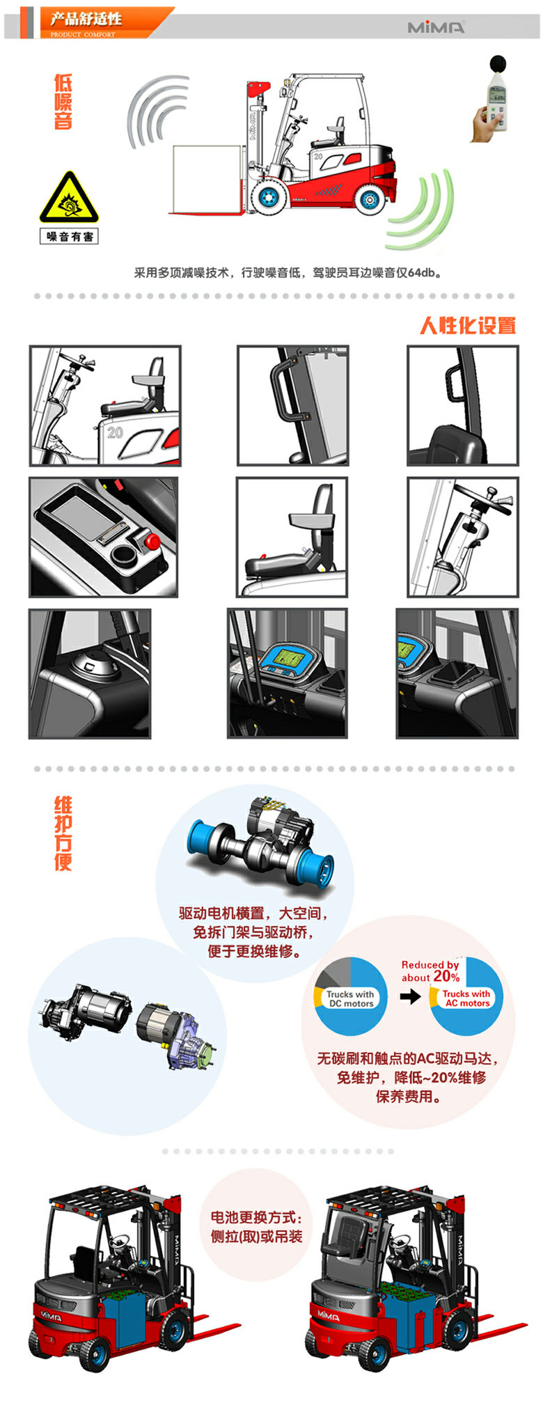 優良的産品性能 1 依照歐洲标準ENSIP EN-ISO 5353中關于SIP要求設計的叉車駕駛室,讓操作更舒适; 2 多功能LCD數字控制儀表具有運行時間顯示、故障代碼顯示、蓄電池顯示、低電壓警示閃
